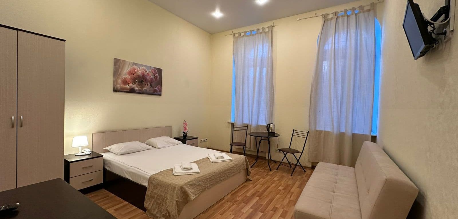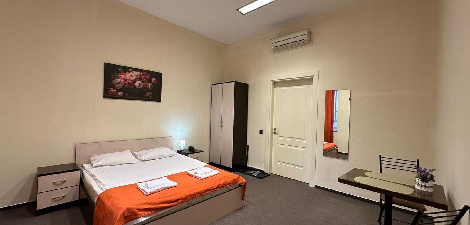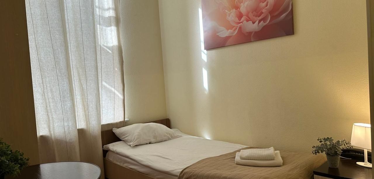В каждом номере есть окно, кровать с постельным бельем, набор полотенец, жк телевизор, тапочки, фен.